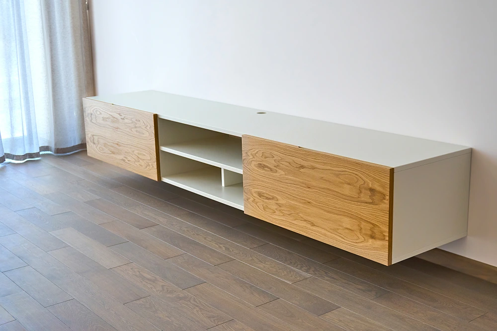 The media wall should be proportionate to the room. For a standard-sized living room, a media setup typically measures between 2.5 and 4 metres in width.